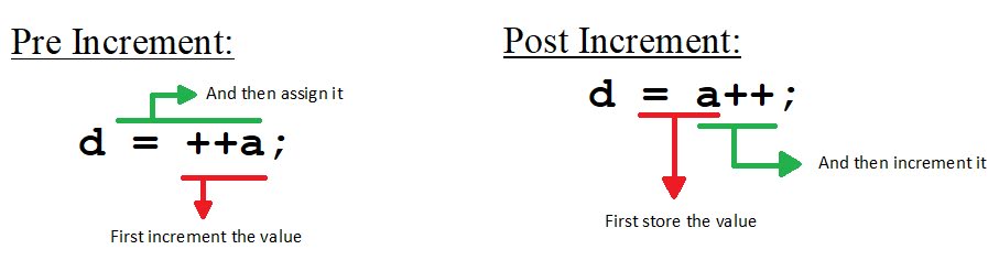The important concept to understand here is the concept of post increment/decrement and pre increment/decrement operators. We can use this ++ and — before and after the name of the variable on which the operation is supposed to be performed. For example, consider the following example: