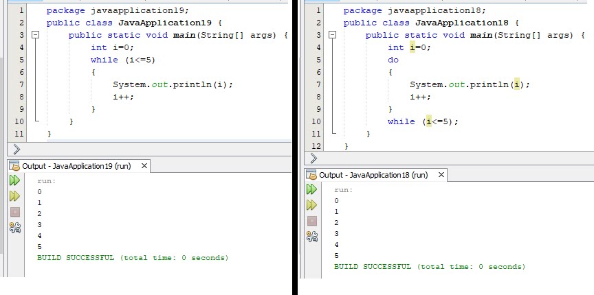 As you saw in the above example, there is no difference in the output of a while loop and a do while loop. The only thing that makes a do while loop unique is that it executes at least once.